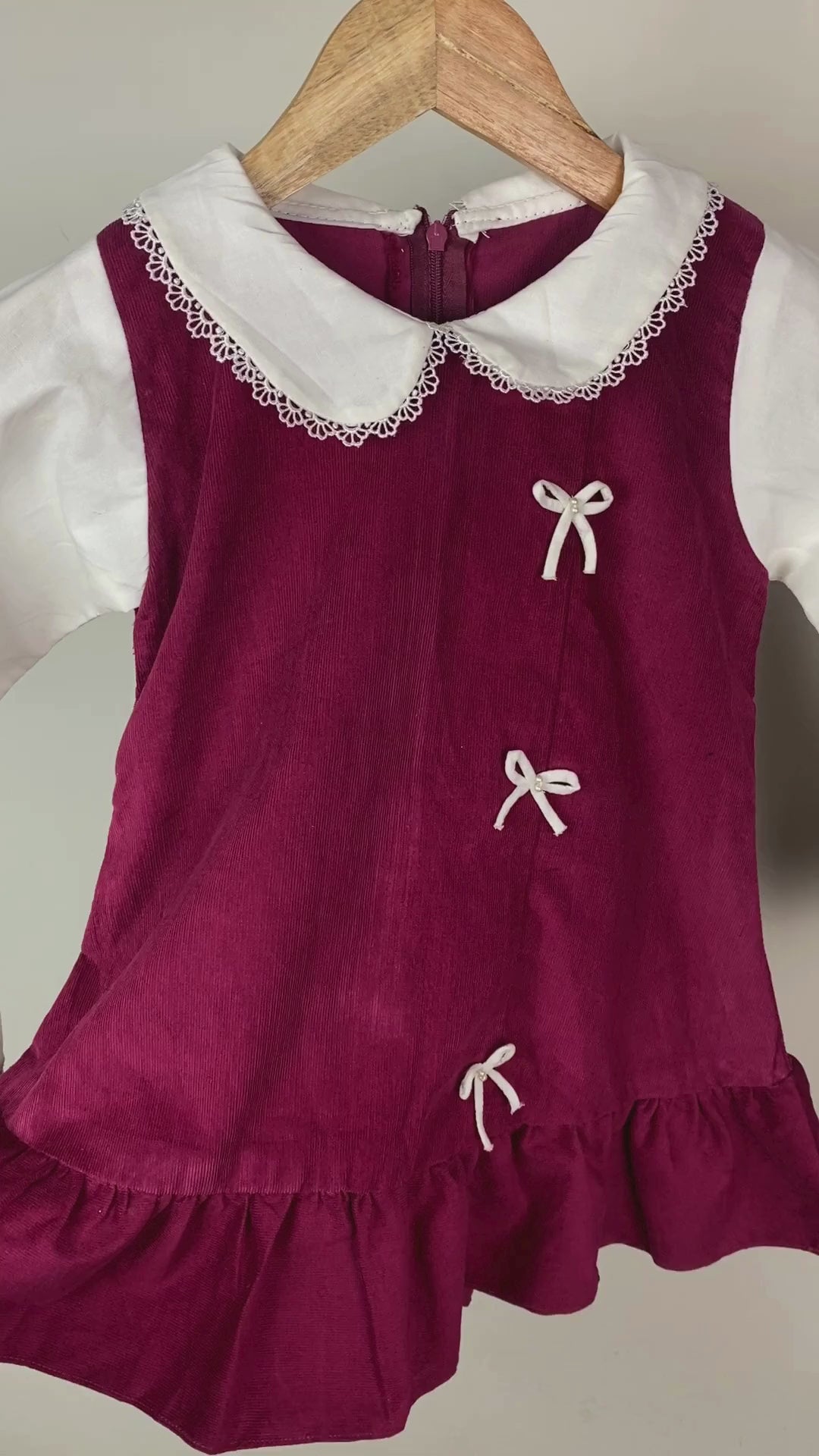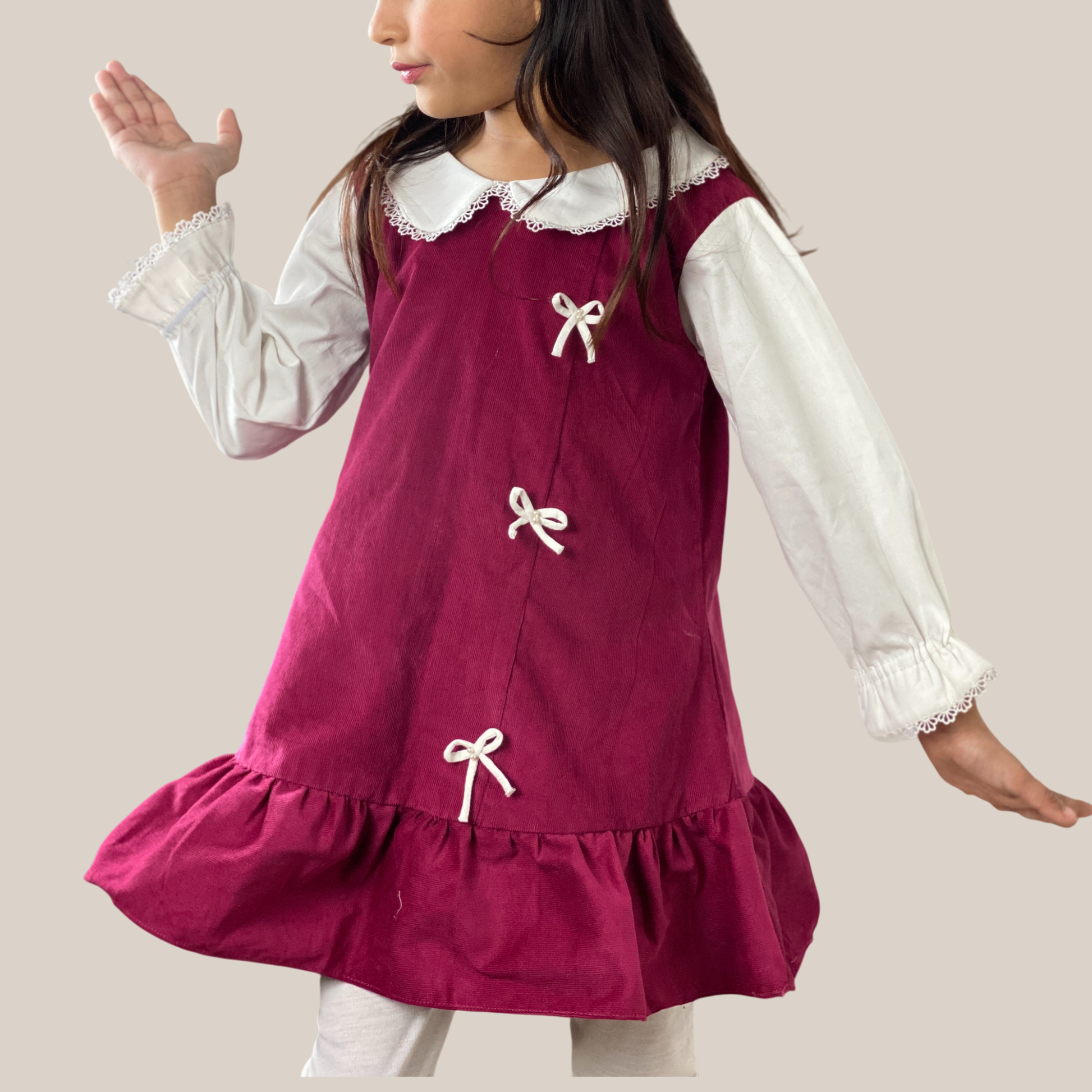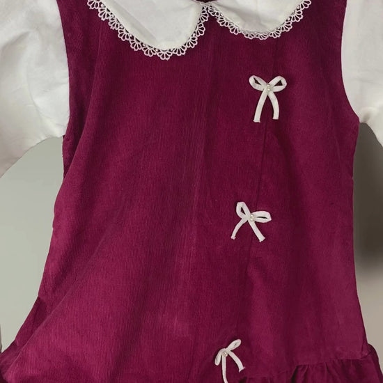 Berry Bow is a premium one-piece dress designed to bring charm and elegance to your little one’s wardrobe. Crafted from rich berry-toned velvet corduroy, this dress features delicate white bows and soft cotton lace sleeves and collar, blending comfort with sophisticated style.