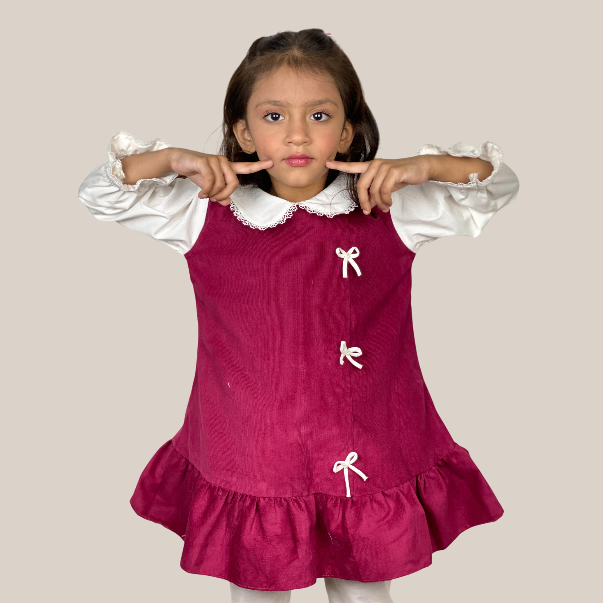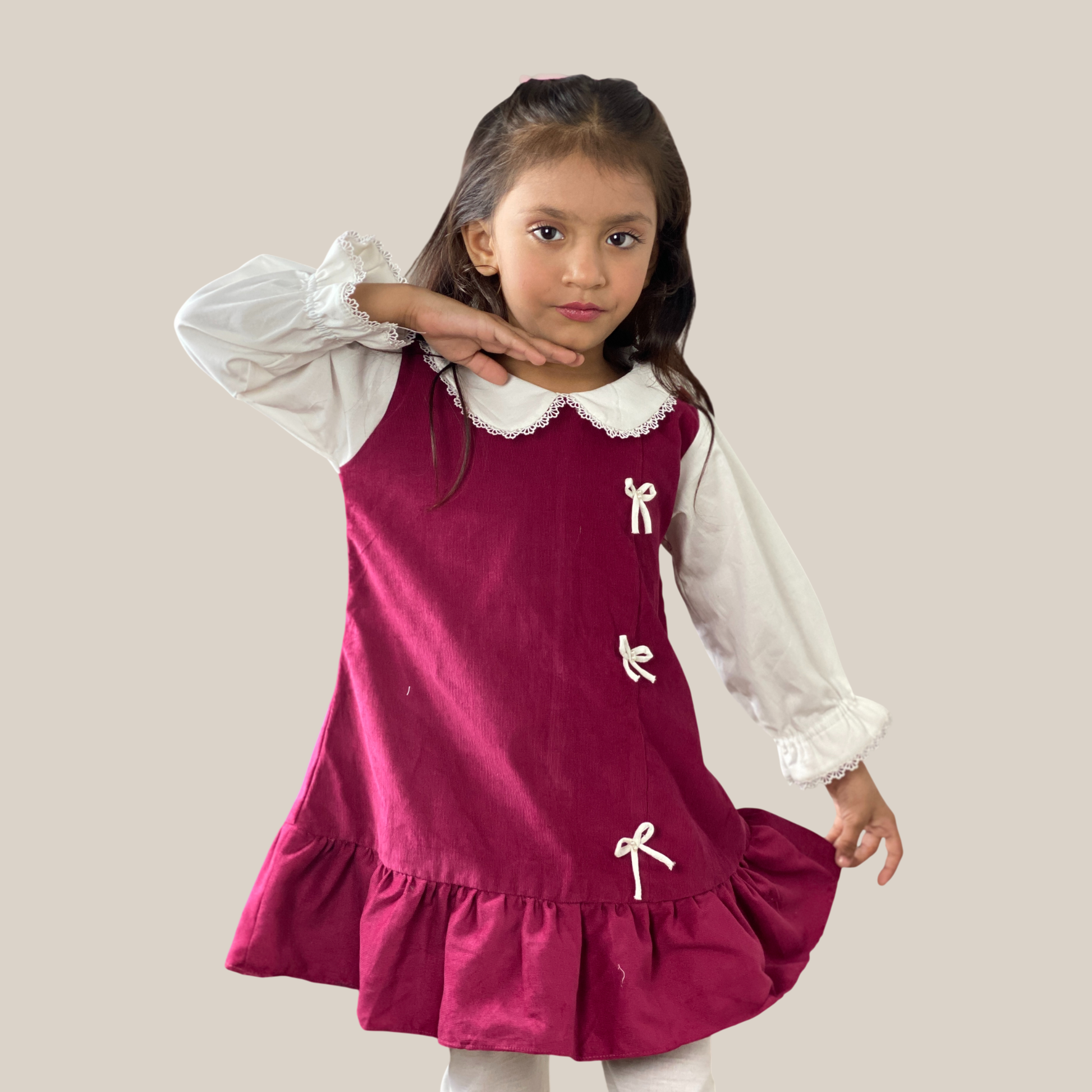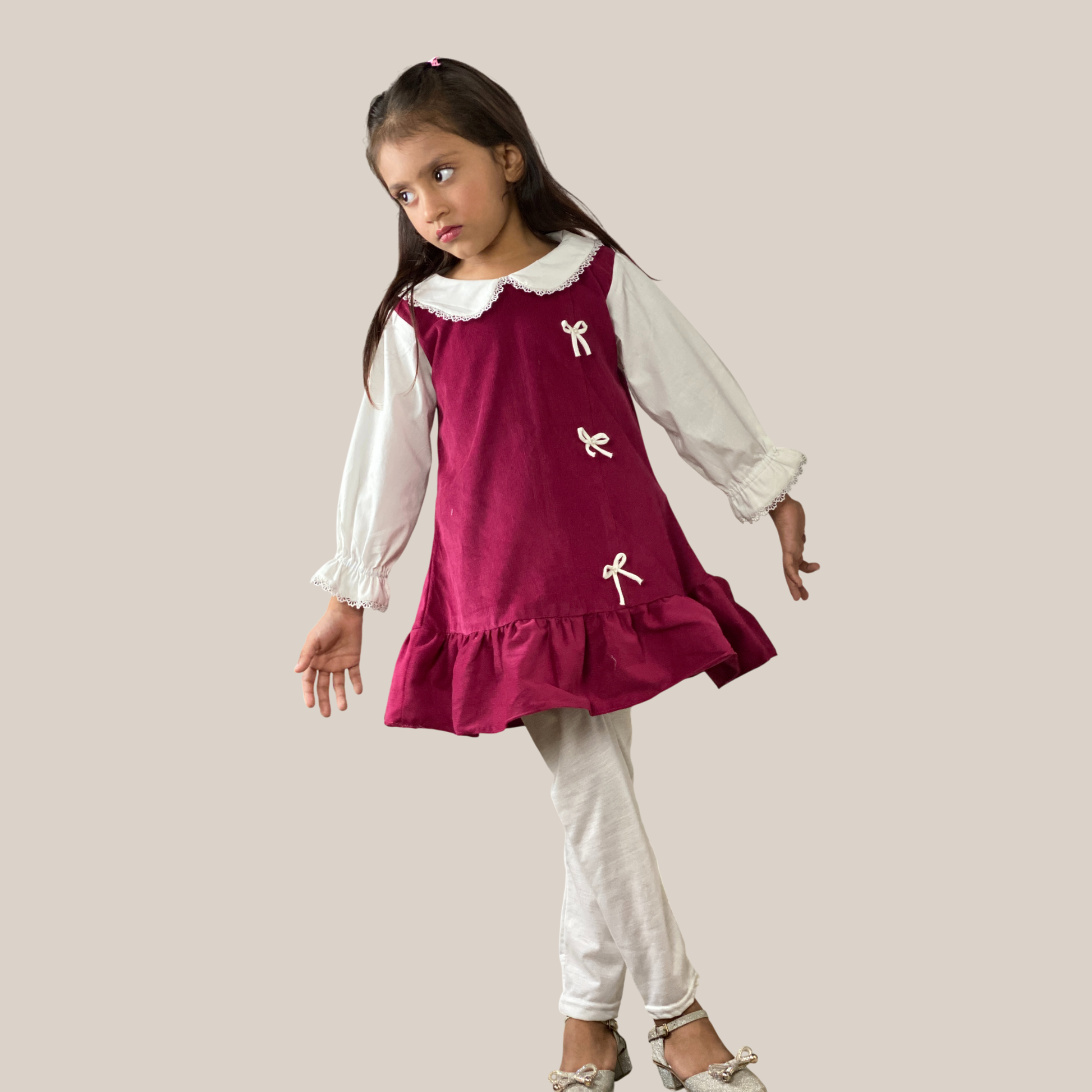 Berry Bow is a premium one-piece dress designed to bring charm and elegance to your little one’s wardrobe. Crafted from rich berry-toned velvet corduroy, this dress features delicate white bows and soft cotton lace sleeves and collar, blending comfort with sophisticated style.