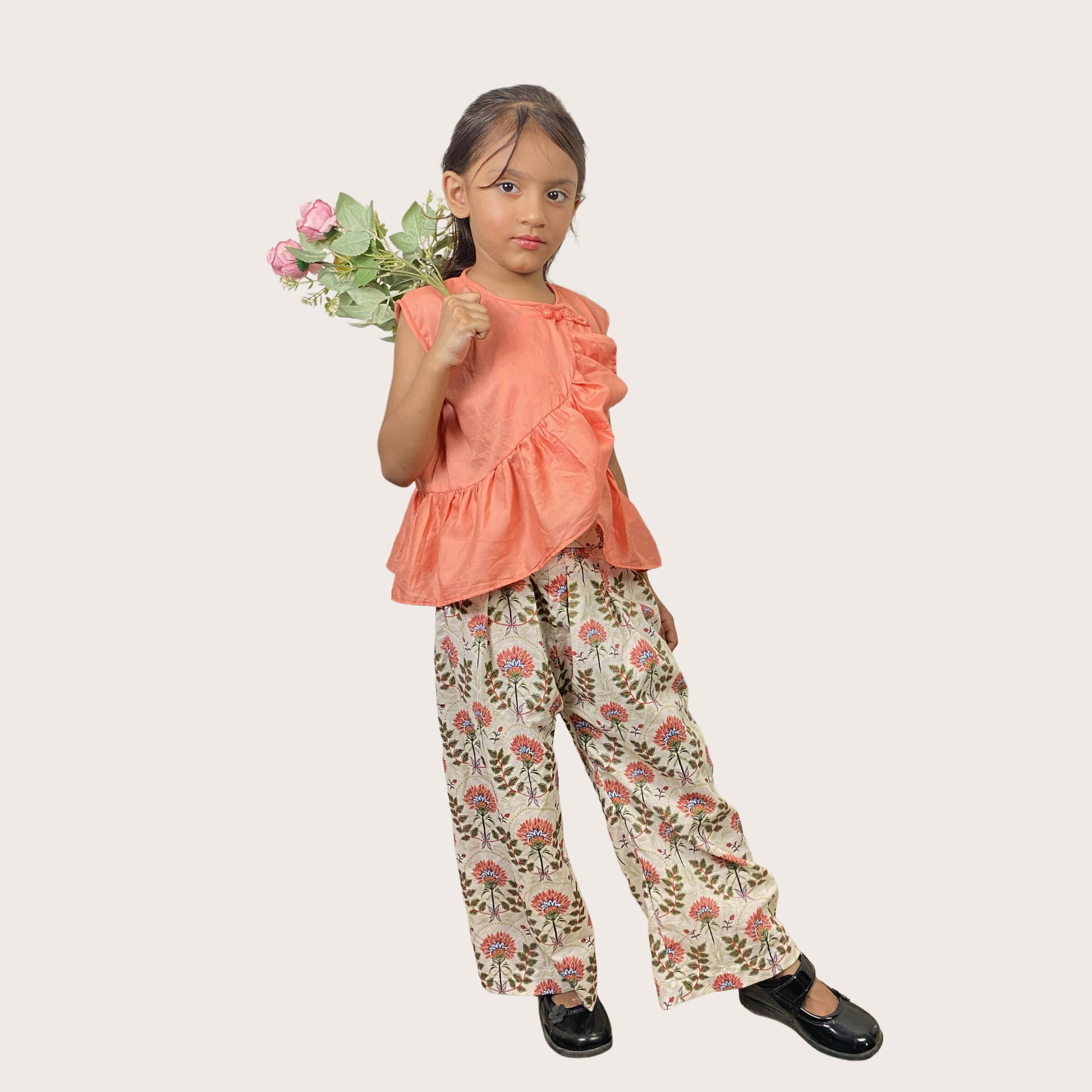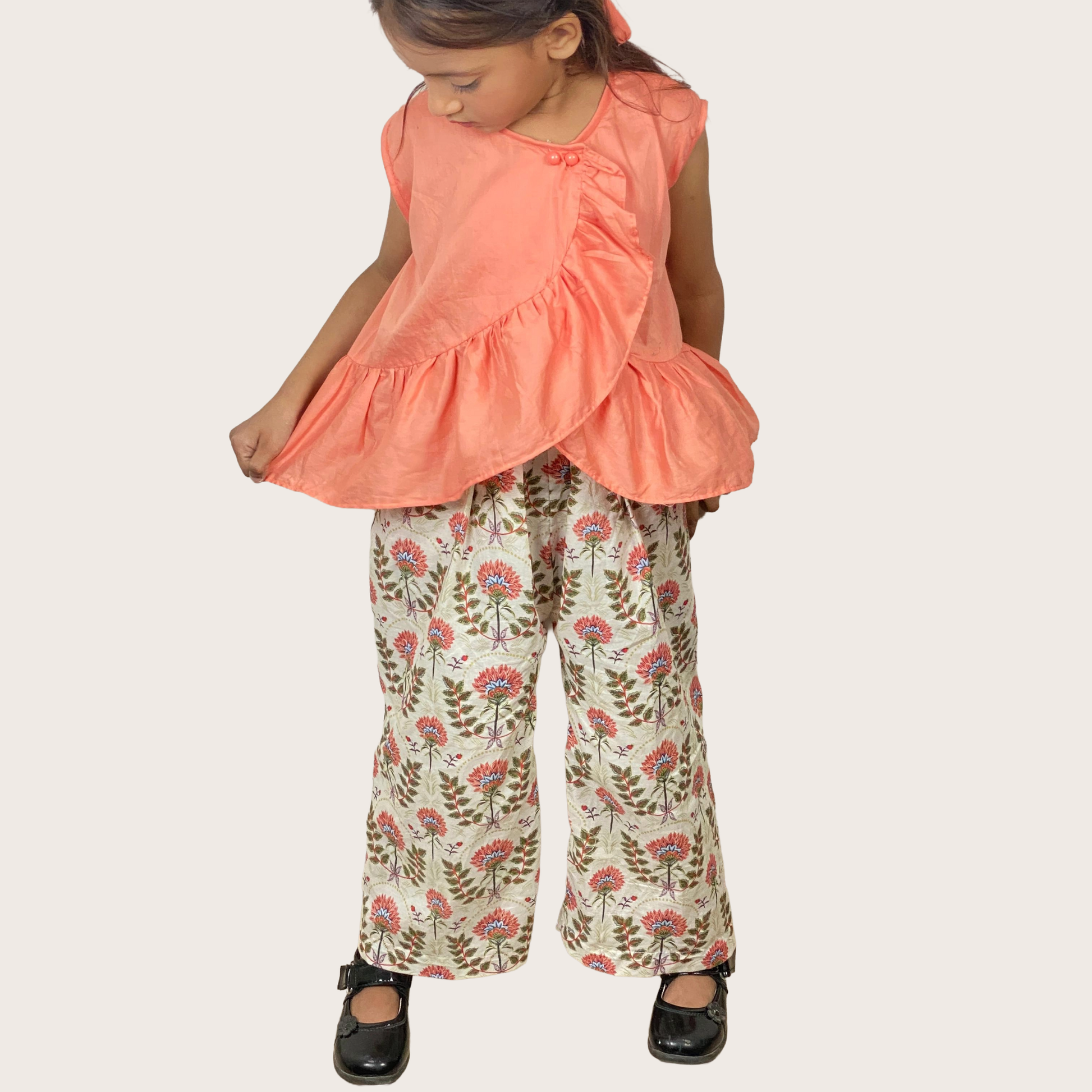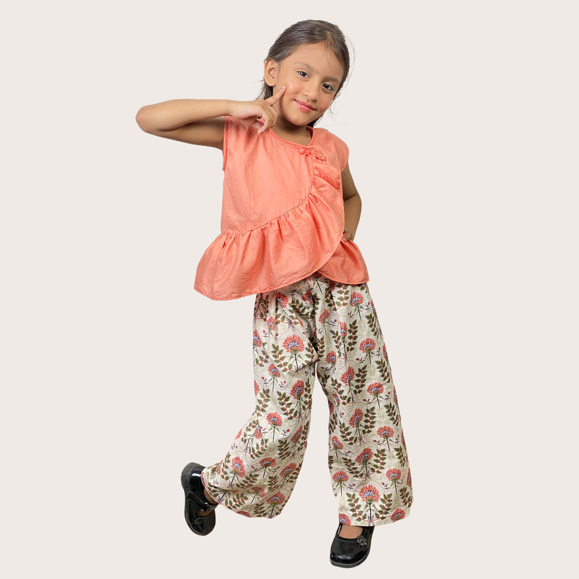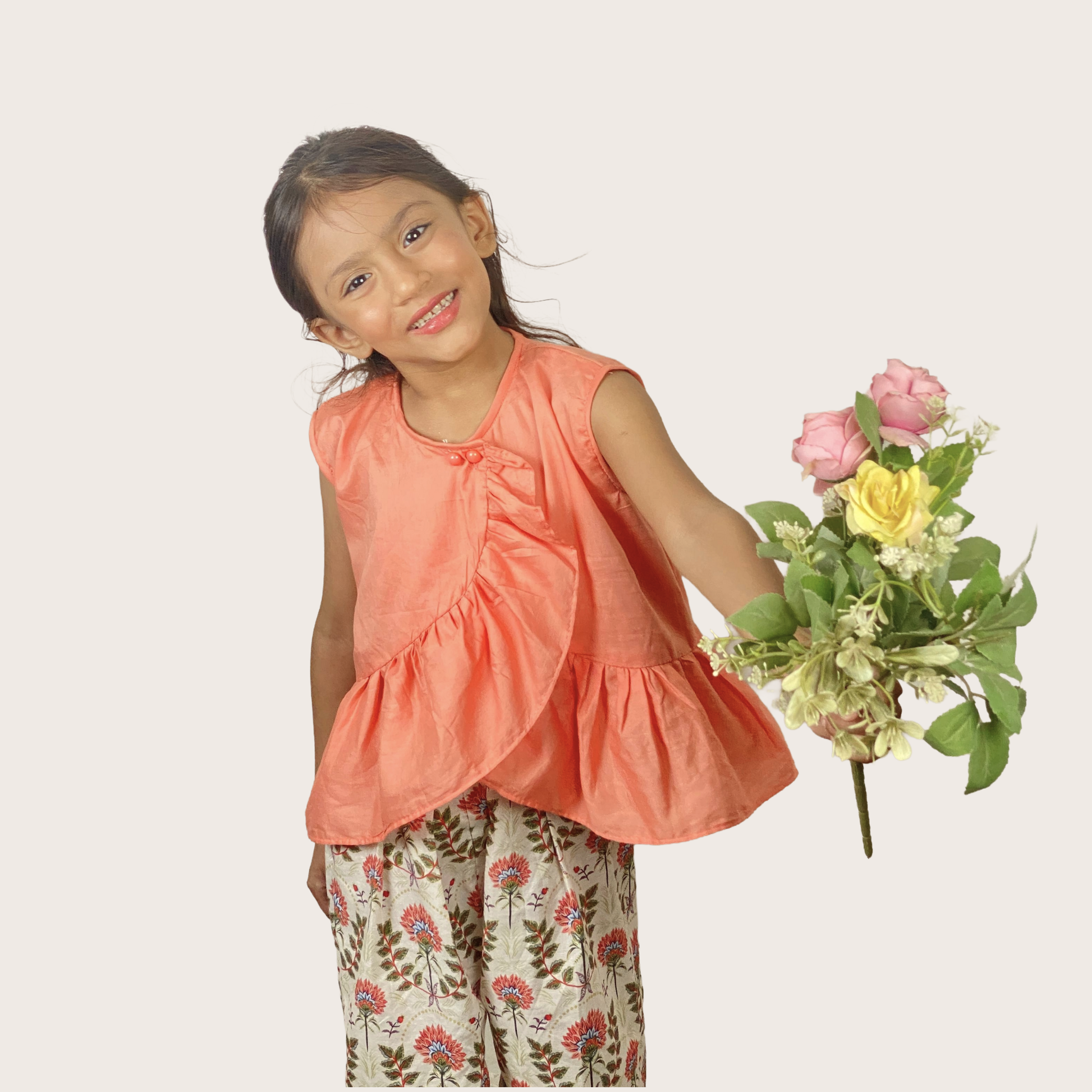 Coral Bloom is a charming two-piece summer outfit designed to keep your little one cool, comfortable, and effortlessly stylish. The sleeveless plain coral top features a round neckline, a front overlap design, and soft frills for a breezy, playful finish.